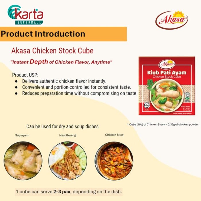 Akasa Chicken Stock Cube provides convenient & instant depth of chicken flavor to enrich your dishes’ taste anytime, anywhere.