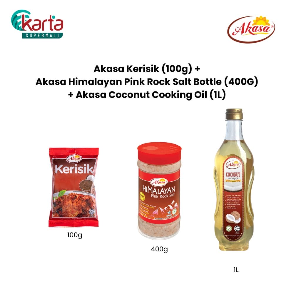 Bundle content :Akasa Kerisik (100g) + Akasa Himalayan Pink Rock Salt Bottle (400G) + Akasa Coconut Cooking Oil (1L)