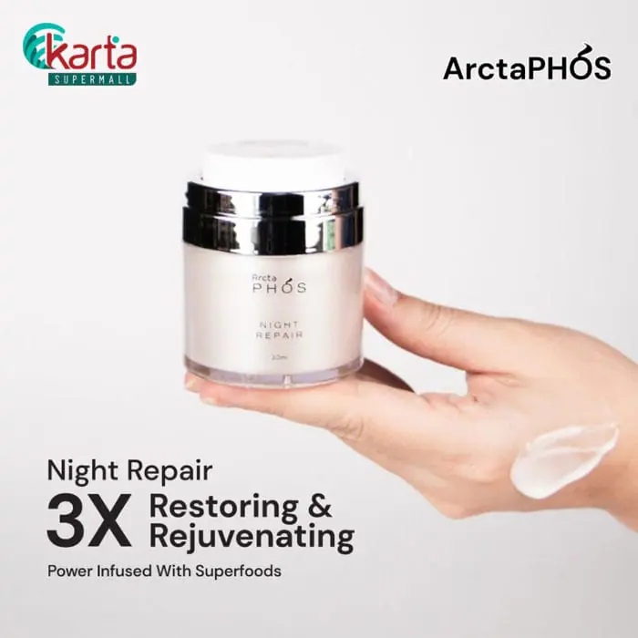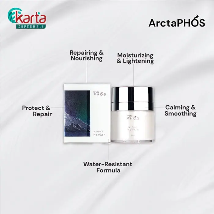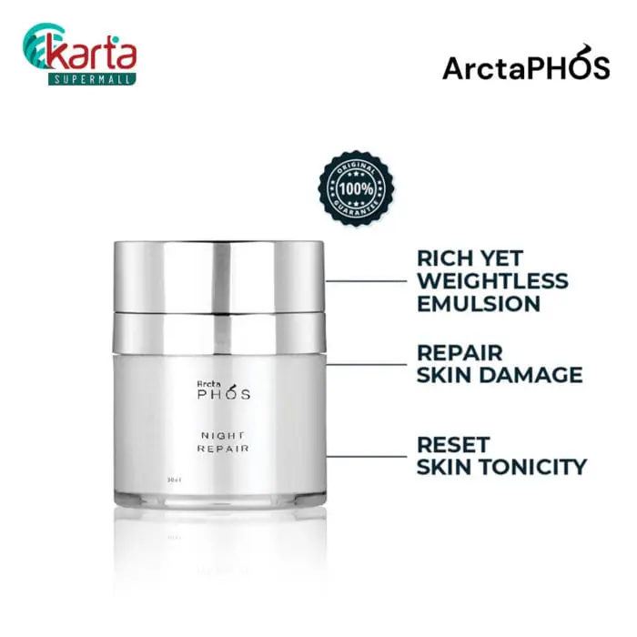 About ArctaPHOS Night Repair (30ml)Anti-Blue Light Series: ArctaPHOS Night Repair (30ml)Description: ArctaPHOS’ Night Repair is a treat for your skin after a busy day! This moisturizer repairs tired skin, resetting its tonicity at night. It’s weightless and non-sticky formula ensures that you enjoy a sound sleep without transferring any product on your pillow.Product Characteristics:– Texture: Emulsion- Color: White- Scent: Unique Characteristic- Skin Benefits: Skin feels hydrated, Minimize pores, Wake up to well-nourished skin- Supported by: Marine Biotechnology, High Purity Plant Extraction, Biofermentation, Cold Pressing1. Marine Biotechnology: This includes discovering new microorganisms from marine habitats, identification of microorganisms, sequencing, amplification and cell culturing to bring out its potent active ingredients.2. High Purity Plant Extraction: We use advanced technology to filter impurities, leaving behind quality plant active concentrates to be used in our products.3. Biofermentation: This technique is widely used in milk production and in baking. In cosmetics, biofermentation uses a strain of microorganism to produce specific components, which is then extracted and undergone purification.4. Cold Pressing: Our botanical oils undergo cold pressing, which means the oil is extracted from its raw source without applying any heat. This ensures the maximum quality of our botanical oil as heating can partially or fully destroy the active components in the raw source.Directions: After cleansing and toning your skin, pump a small amount into your hands and gently massage the product onto your face and neck. Use in the evening after applying ArctaPHOS’ Tonic Lotion.Key Ingredients: Chia Seed (This superfood for the skin is loaded with high levels of phyto-nutrients such as Omega 3, Omega 6, Vitamin and antioxidants. It minimizes skin discomfort after a hectic day while boosting skin’s hydration levels.) Aloe Vera Juice (A globally recognised ingredient for soothing damaged skin caused by daily stress and exposure to pollutants. It has also been proven to enhance cell proliferation and improves skin’s appearance.) Niacinamide (Vitamin B3) (This highly stable vitamin offers arrange of skin benefit, including brightening skin, leaving you with fairer complexion. We use the purest form of Niacinamide in our formulation to ensure the safety and efficacy of our product.) Bacillus Ferment (This is a rare marine active ingredient obtained from the turquoise waters of Mauritius Island. A hectic lifestyle, coupled with stress and weather changes can weaken our skin, leaving it dry and dull. However, this unique ingredient resets skin tonicity by sealing the skin’s hydration levels to restore its softness, and giving it a healthy glow.) Argan (Another skin superfood makes the list. Our Argan Oil is sourced from Morocco and contains tocopherols, polyphenol, squalene and unique sterols to help skin regenerate its barrier and elasticity) Ceramide (Ceramides are lipids that are present in our skin that help it retain its moisture. Our botanical-derived ceramides increase the moisture and elasticity of our skin. At night, it is an important building block for our skin to repair its own barrier function.) Natural Betaine (This ingredient, which is derived from sugar beetroot, delivers powerful hydration to the skin due to its ability to lock in moisture for lasting hydration, It is among our skin’s key Natural Moisturizing Factor components.)The NO list: Mercury, Mercury Compounds, Steroids, Artificial colors, Alcohol, Petrolatum, Mineral oil, Lanolin, Triclocarban, Triclosan, SLES/SLS/ALS, Animal-derived ingredients, Soap, Retinoic Acid, Hydroquinone, Benzophenone-3, Parabens, Formaldehyde-releasing preservatives, Bisphenol A, Methylchloroisothiazolinone, Phthalates, Ethanolamines (TEA/DEA/MEA), Benzalkonium Chloride and Octyl Methoxycinnamate