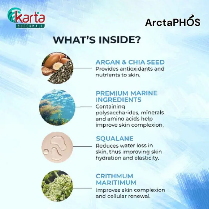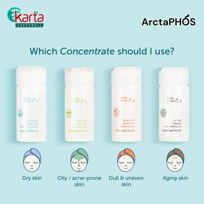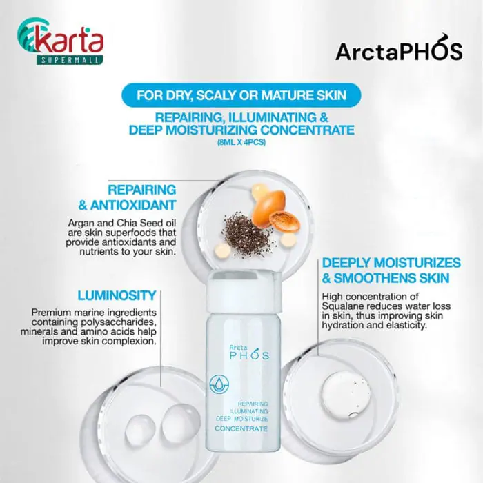 About ArctaPHOS Repairing, Illuminating & Deep Moisturizing Concentrate (8ML)Description: This concentrate is primarily made of Squalane, which is obtained through the fermentation of sugarcane. Squalane is a powerful emollient that can reduce water loss in skin and restore skin suppleness. This ultra-moisturizing concentrate also repairs and increases the luminosity of your skin, leaving you with a more youthful look.Directions: Apply 2-3 drops of the concentrate onto your face and neck daily. Gentle massage until fully absorbed. It can be used with other skin care product. For better results, use daily, both mornings and evenings after applying ArctaPHOS’s Tonic Lotion and Multi-Protect Day Moisturizer or Night Repair.Key Ingredients: Squalane (This ingredient is 100% plant derived; with long-term use, it reduces skin’s roughness, illuminates your skin and provides long lasting moisturizing effects. It is highly compatible with various skin types and feels non-greasy after application.) Vitamin E (This powerful antioxidant repairs skin that has been damaged from harmful radicals. It also improves the skin’s structure for healthier looking skin.) Crithmum Maritimum (This rare plant has the ability to survive under rocks which are regularly exposed to waves. Its hydrophobic molecules play an important role in its stability to survive harsh conditions, which has also proven beneficial to human skin. These molecules can help improve skin complexion and cellular renewal.) Grapeseed (A lightweight, natural emollient that calms and deeply moisturizes the skin.) Chia Seed (This skin superfood is loaded with high levels of phyto-nutrients such as Omega 3, Omega 6, Vitamin and antioxidants. It minimizes skin discomfort after a hectic day while boosting skin’s hydration levels.) Argan (Another skin superfood is Argan Oil. Our Argan Oil is sourced from Morocco and contains tocopherols, polyphenol, squalene and unique sterols to help skin regenerate its barrier and elasticity.)The NO list: Mercury, Mercury Compounds, Steroids, Artificial colors, Alcohol, Petrolatum, Mineral oil, Lanolin, Triclocarban, Triclosan, SLES/SLS/ALS, Animal-derived ingredients, Soap, Silicones, Retinoic Acid, Hydroquinone, Benzophenone-3, Parabens, Formaldehyde-releasing preservatives, Bisphenol A, Methylchloroisothiazolinone, Phthalates, Ethanolamines (TEA/DEA/MEA), Benzalkonium Chloride and Octyl Methoxycinnamate, Fragrance