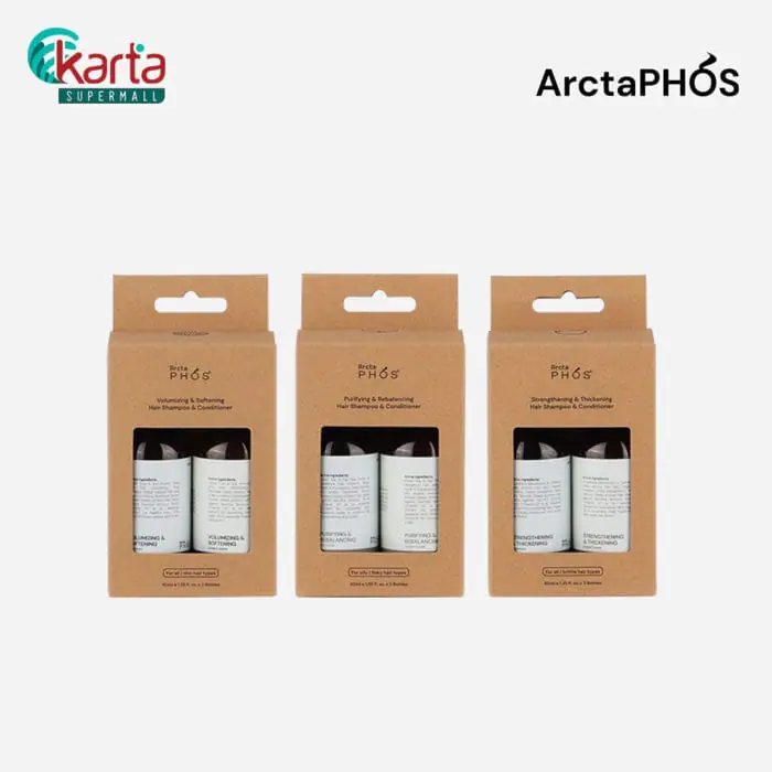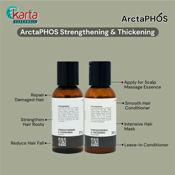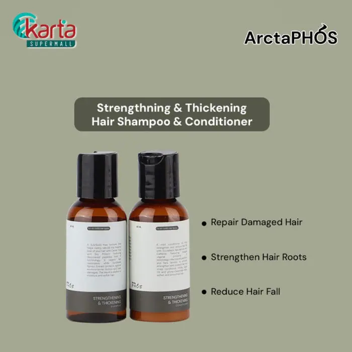 About ArctaPHOS Strengthening & Thickening shampoo + conditioner travel set (40ml x 2pcs)Unveil the secret to luscious locks with our Hair Series collection at ArctaPHOS. Transform your hair care routine into a ritual of rejuvenation, as our meticulously crafted products breathe life into your strands. From revitalizing shampoos to deeply nourishing treatments, each product is a testament to our commitment to your hair’s health and beauty. Experience the brilliance of salon-quality care in the comfort of your home. Discover the hair you’ve always dreamed of with ArctaPHOS Hair Series.1. ArctaPHOS Strengthening & Thickening shampooProduct Description:– A mild shampoo that helps strengthen & reduce hair fall with Scutellaria Baicalensis and Caffeine.Featuring multiple vegetal proteins to provide important nutrients for hair strenthening & thickening. It is further enriched with AI Technology – Discovered peptides & Tara Tannins to visibly reboot, smoothen & protect hair and scalp conditions.- Repairs Hair Damage & promotes Hair Growth- For all hair types- Scent: AppleHow to use: Massage onto wet hair. Lather & rinse thoroughly. Best paired with ArctaPHOS Hair Conditioner.2. ArctaPHOS Strengthening & Thickening ConditionerProduct Benefits:– Promotes Hair Growth- Reduces Hair Fall- Strengthens Hair Roots- Repairs Hair DamageWhat’s so special about our 4-in-1 Conditioner?• Scalp Massage Essence: Healthy, nourished hair roots, promote hair growth, and reduce hair loss• Smoothening Hair Conditioner: Soften, smoothen, and tangle-free hair• Intensive Hair Mask: Repair, nourish, and strengthen hair• Milk Hair Serum: Soft, healthy, manageable hairHow to use: Dispense desired amount & massage evenly onto cleansed, damp hair. Leave for a minute or two and rinse thoroughly. Best paired with ArctaPHOS Hair Shampoo.NOTE:Our shampoo & conditioner are safe to be used for pregnant women, breastfeeding moms, and kids 2 years above.Our shampoo & conditioner contain natural and premium ingredients that are eco-friendly.Key Ingredients: Caffeine, Plant Proteins, Argan Oil, AppleInside the Box: 1x Shampoo & Conditioner