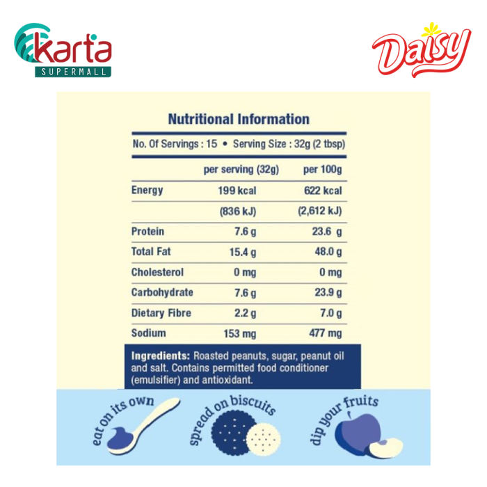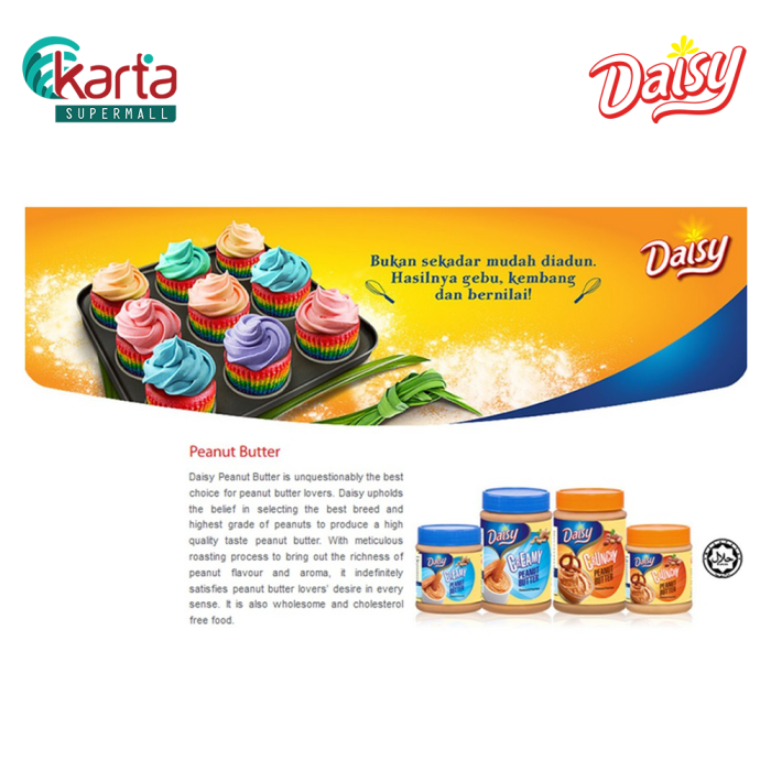Daisy Peanut Butter is unquestionably the best choice for peanut butter lovers. Daisy upholds the belief in selecting the best breed and highest grade of peanuts to produce a high quality taste peanut butter. With meticulous roasting process to bring out the richness of peanut flavour and aroma, it indefinitely satisfies peanut butter lovers’ desire in every sense. It is also wholesome and cholesterol free food.