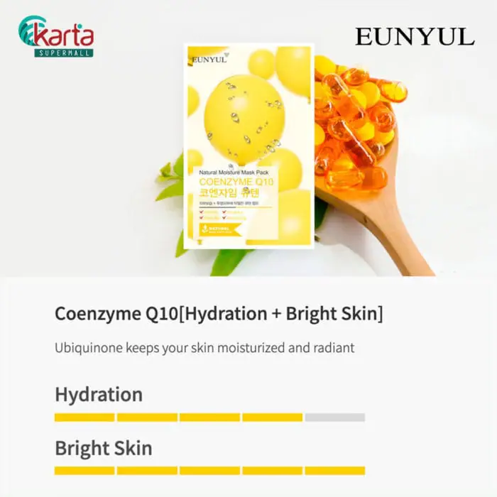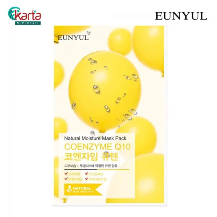 About EUNYUL Natural Moisture Mask Pack 22ml – CoenzymeEUNYUL Q10 Mask Sheet Pack enriches the skin with Q10 which helps to prevent loss of moisture.It can instantly nourishes dehydrated skin and keeps the skin soft and moist. Specification: 22ml Skin Type: All Skin Type, Dry Skin, Normal Skin Benefits: Hydrating, Anti-Aging, Fine Lines, Wrinkles, Revitalizing Skin Concern: Aging Skin, Dryness, Fine Lines & Wrinkles Directions of Use:1. The EUNYUL mask sheet helps to boost skin hydration and texture. Before applying the mask sheet, kindly apply the toner first after washing your face with a cleanser to remove any traces of make-up and impurities.2. You need to spread out the folded mask sheet evenly after taking it out from the pouch.3. You need to adjust your mask’s position according to your eyes, nose and mouth’s positions and then you may adhere the Mask Sheet firmly on the face.*Please keep the mask on for 15-20 minutes so that your skin can effectively absorb the active ingredients.4. After removing the mask sheet, you can tap on your face gently to allow the skin to absorb the remaining ingredients on the skin’s surface.5. Gently massage with fingers to enhance the absorption of the remaining essence into the skin.Cautions:1. Stop using it immediately if you experienced any allergic response or skin irritations. If you continued to use, the skin problem might get worse. Kindly consult a dermatologist or seek medical advice accordingly.a) Kindly seek medical help if you experienced any of the symptoms such as red spots, tumefaction, urtication, skin irritation and etc.b) The above symptoms may also apply when you are exposed to direct sunlight. 2. Don’t apply on wounds, eczema, dermatitis and so on. 3. Storage Requirementsa) Please keep the pouch shut after using the mask sheet.b) Please keep the product out of infant and chlidren’s reach.c) Please keep the product away from direct sunlight and high temperature exposure. IngredientsPurified Water, Glycerin, Propylene Glycol, Ethanol, Butylene Glycol, Sodium Hyaluronate,Vaccinium Angustifolium (Blueberry) Fruit Extract, Rubus Idaeus (Raspberry) Fruit Extract, Provence Rose Flower Water, Portulaca Oleracea Extract, Scutellaria Baicalensis Root Extract, Paeonia Albiflora Root Extract, Lonicera Japonica (Floneysuckle) Flower Extract, 1,2-Flexanediol, Florse Oil (1,000ppm), Betaine, Carbomer, Triethanolamine, Allantoin, Xanthan Gum, Polysorbate 20, Ethylhexylglycerin, Disodium EDTA, Phenoxyethanol, Fragrance