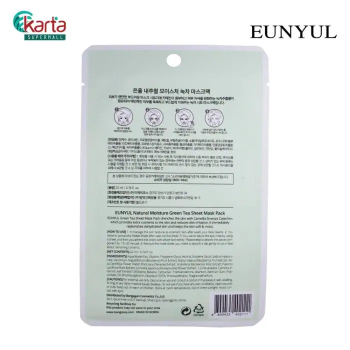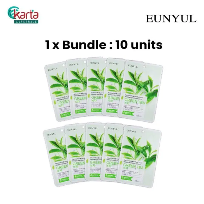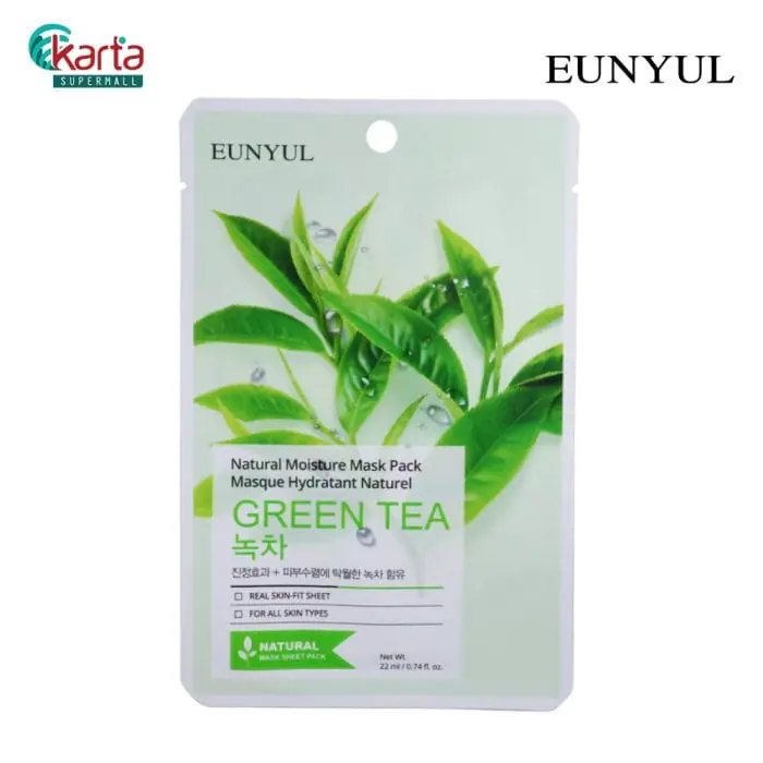 About EUNYUL Natural Moisture Mask Pack 22ml – Green Tea X 10s SetEUNYUL Green Tea Mask Sheet Pack drenches the skin with Camellia Sinensis Catechins which provides extra nutrients to the skin and reduces skin irritation.It immediately replenishes dehydrated skin and keeps the skin soft and moist.Specification: 22mlSkin Type: All Skin Type, Dry Skin, Normal SkinBenefits: Hydrating, Oil Control, Anti-AcneSkin Concern: Oiliness, Acne & BlemishesDirections of Use:1. The EUNYUL mask sheet helps to boost skin hydration and texture. Before applying the mask sheet, kindly apply the toner first after washing your face with a cleanser to remove any traces of make-up and impurities.2. You need to spread out the folded mask sheet evenly after taking it out from the pouch.3. You need to adjust your mask’s position according to your eyes, nose and mouth’s positions and then you may adhere the Mask Sheet firmly on the face.*Please keep the mask on for 15-20 minutes so that your skin can effectively absorb the active ingredients.4. After removing the mask sheet, you can tap on your face gently to allow the skin to absorb the remaining ingredients on the skin’s surface.5. Gently massage with fingers to enhance the absorption of the remaining essence into the skin.Cautions:1. Stop using it immediately if you experienced any allergic response or skin irritations. If you continued to use, the skin problem might get worse. Kindly consult a dermatologist or seek medical advice accordingly.a) Kindly seek medical help if you experienced any of the symptoms such as red spots, tumefaction, urtication, skin irritation and etc.b) The above symptoms may also apply when you are exposed to direct sunlight.2. Don’t apply on wounds, eczema, dermatitis and so on.3. Storage Requirementsa) Please keep the pouch shut after using the mask sheet.b) Please keep the product out of infant and chlidren’s reach.c) Please keep the product away from direct sunlight and high temperature exposure.IngredientsPurified Water, Glycerin, Propylene Glycol, Ethanol, Butylene Glycol, Sodium Hyaluronate,Vaccinium Angustifolium (Blueberry) Fruit Extract, Rubus Idaeus (Raspberry) Fruit Extract, Provence Rose Flower Water, Portulaca Oleracea Extract, Scutellaria Baicalensis Root Extract, Paeonia Albiflora Root Extract, Lonicera Japonica (Honeysuckle) Flower Extract, 1,2-Hexanediol, Betaine, Carbomer, Triethanolamine, Allantoin, Xan-than Gum, Polysorbate 20, Ethylhexylglycerin, Disodium EDTA, Phenox-yethanol, Fragrance