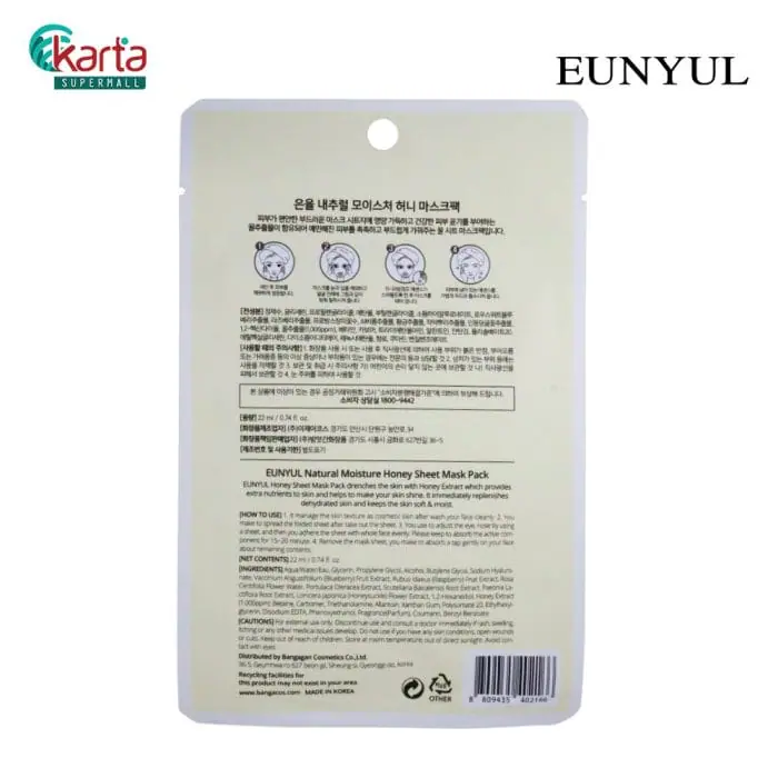 About EUNYUL Natural Moisture Mask Pack 22ml- Honey X 10s SetEUNYUL Honey Mask Sheet Pack drenches the skin with Honey Extract which provides extra nutrients to skin and helps to make yout skin shine.It immediately replenishes dehydrated skin and keeps the skin soft and moist.Specification: 22mlSkin Type: All Skin Type, Dry Skin, Normal SkinBenefits: Repairing, Hydrating, RevitalizingSkin Concern: DrynessDirections of Use:1. The EUNYUL mask sheet helps to boost skin hydration and texture. Before applying the mask sheet, kindly apply the toner first after washing your face with a cleanser to remove any traces of make-up and impurities.2. You need to spread out the folded mask sheet evenly after taking it out from the pouch.3. You need to adjust your mask’s position according to your eyes, nose and mouth’s positions and then you may adhere the Mask Sheet firmly on the face.*Please keep the mask on for 15-20 minutes so that your skin can effectively absorb the active ingredients.4. After removing the mask sheet, you can tap on your face gently to allow the skin to absorb the remaining ingredients on the skin’s surface.5. Gently massage with fingers to enhance the absorption of the remaining essence into the skin.Cautions:1. Stop using it immediately if you experienced any allergic response or skin irritations. If you continued to use, the skin problem might get worse. Kindly consult a dermatologist or seek medical advice accordingly.a) Kindly seek medical help if you experienced any of the symptoms such as red spots, tumefaction, urtication, skin irritation and etc.b) The above symptoms may also apply when you are exposed to direct sunlight.2. Don’t apply on wounds, eczema, dermatitis and so on.3. Storage Requirementsa) Please keep the pouch shut after using the mask sheet.b) Please keep the product out of infant and chlidren’s reach.c) Please keep the product away from direct sunlight and high temperature exposure.IngredientsPurified Water, Glycerin, Propylene Glycol, Ethanol, Butylene Glycol, Sodium Hyaluronate,Vaccinium Angustifolium (Blueberry) Fruit Extract, Rubus Idaeus (Raspberry) Fruit Extract, Provence Rose Flower Water, Portulaca Oleracea Extract, Scutellaria Baicalensis Root Extract, Paeonia Albiflora Root Extract, Lonicera Japonica (Honeysuckle) Flower Extract, 1,2-Hexanediol, Hydrolyzed Collagen (1,000ppm), Betaine, Carbomer, Triethanolamine, Allantoin, Xanthan Gum, Polysorbate 20, Ethylhexylg-lycerin, Disodium EDTA, Phenoxyethanol, Fragrance