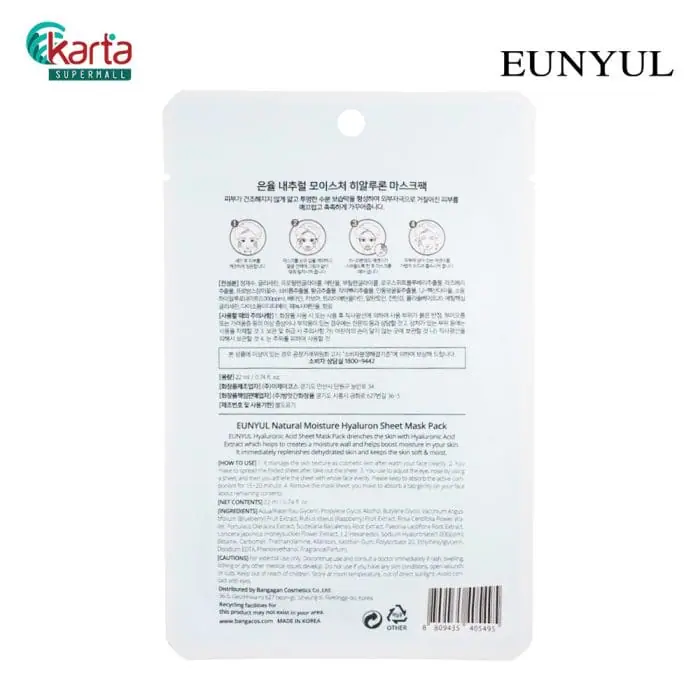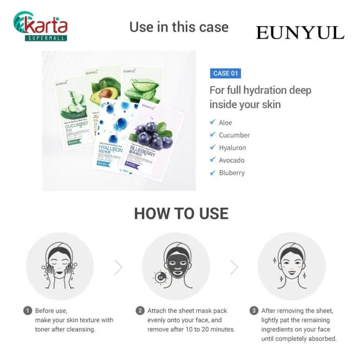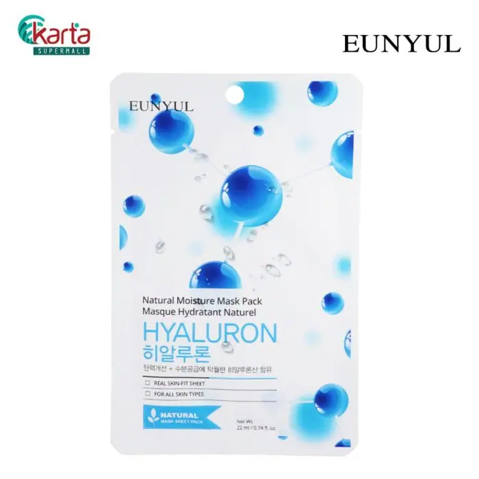 About EUNYUL Natural Moisture Mask Pack 22ml – Hyaluron X 10s SetEUNYUL Hyaluronic Acid Mask Sheet Pack drenches the skin with Hyaluronic Acid Extract which helps to create moisture and helps boost moisture in your skin.It immediately replenishes dehydrated skin and keeps the skin soft & moist.Specification: 22mlSkin Type: All Skin Type, Dry Skin, Normal SkinBenefits: HydratingSkin Concern: Dryness, Uneven Skin ToneDirections of Use:1. The EUNYUL mask sheet helps to boost skin hydration and texture. Before applying the mask sheet, kindly apply the toner first after washing your face with a cleanser to remove any traces of make-up and impurities.2. You need to spread out the folded mask sheet evenly after taking it out from the pouch.3. You need to adjust your mask’s position according to your eyes, nose and mouth’s positions and then you may adhere the Mask Sheet firmly on the face.*Please keep the mask on for 15-20 minutes so that your skin can effectively absorb the active ingredients.4. After removing the mask sheet, you can tap on your face gently to allow the skin to absorb the remaining ingredients on the skin’s surface.5. Gently massage with fingers to enhance the absorption of the remaining essence into the skin.Cautions:1. Stop using it immediately if you experienced any allergic response or skin irritations. If you continued to use, the skin problem might get worse. Kindly consult a dermatologist or seek medical advice accordingly.a) Kindly seek medical help if you experienced any of the symptoms such as red spots, tumefaction, urtication, skin irritation and etc.b) The above symptoms may also apply when you are exposed to direct sunlight.2. Don’t apply on wounds, eczema, dermatitis and so on.3. Storage Requirementsa) Please keep the pouch shut after using the mask sheet.b) Please keep the product out of infant and chlidren’s reach.c) Please keep the product away from direct sunlight and high temperature exposure.IngredientsPurified Water, Glycerin, Propylene Glycol, Ethanol, Butylene Glycol, Vaccinium Angustifolium (Blueberry) Fruit Extract, Rubus Idaeus (Raspberry) Fruit Extract, Provence Rose Flower Water, Portulaca Oleracea Extract, Scutellaria Baicalensis Root Extract, Paeonia Albiflora Root Extract, Lonicera Japonica (Floneysuckle) Flower Extract, 1,2-Hexanediol, Sodium Flyaluronate (1,000ppm), Betaine, Carbomer, Triethanolamine, Xanthan Gum, Polysorbate 20, Ethylhexylglycerin, Disodium EDTA, Phe-noxyethanol, Fragrance