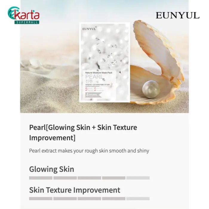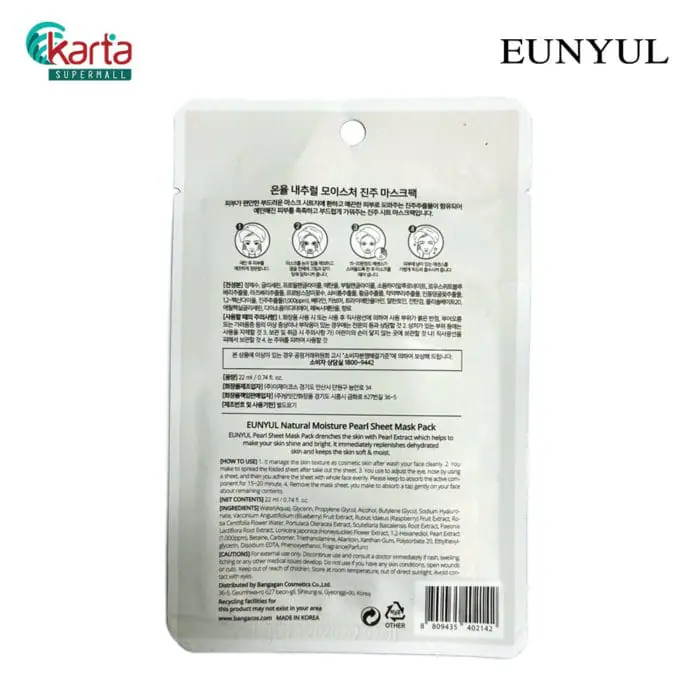 About EUNYUL Natural Moisture Mask Pack 22ml – PearlEUNYUL Pearl Mask Sheet Pack drenches the skin with Pearl Extract which helps to makes your skin shine and bright.It immediately replenishes dehydrated skin and keeps the skin soft and moist. Specification: 22ml Skin Type: All Skin Type, Dry Skin, Normal Skin Benefits: Brightening, Hydrating, Spot Lightening Skin Concern: Dull Skin, Dryness, Uneven Skin Tone, Dark Spots Directions of Use:1. The EUNYUL mask sheet helps to boost skin hydration and texture. Before applying the mask sheet, kindly apply the toner first after washing your face with a cleanser to remove any traces of make-up and impurities.2. You need to spread out the folded mask sheet evenly after taking it out from the pouch.3. You need to adjust your mask’s position according to your eyes, nose and mouth’s positions and then you may adhere the Mask Sheet firmly on the face.*Please keep the mask on for 15-20 minutes so that your skin can effectively absorb the active ingredients.4. After removing the mask sheet, you can tap on your face gently to allow the skin to absorb the remaining ingredients on the skin’s surface.5. Gently massage with fingers to enhance the absorption of the remaining essence into the skin. Cautions:1. Stop using it immediately if you experienced any allergic response or skin irritations. If you continued to use, the skin problem might get worse. Kindly consult a dermatologist or seek medical advice accordingly.a) Kindly seek medical help if you experienced any of the symptoms such as red spots, tumefaction, urtication, skin irritation and etc.b) The above symptoms may also apply when you are exposed to direct sunlight. 2. Don’t apply on wounds, eczema, dermatitis and so on. 3. Storage Requirementsa) Please keep the pouch shut after using the mask sheet.b) Please keep the product out of infant and chlidren’s reach.c) Please keep the product away from direct sunlight and high temperature exposure.IngredientsPurified Water, Glycerin, Propylene Glycol, Ethanol, Butylene Glycol, Sodium Hyaluronate,Vaccinium Angustifolium (Blueberry) Fruit Extract, Rubus Idaeus (Raspberry) Fruit Extract, Provence Rose Flower Water, Portulaca Oleracea Extract, Scutellaria Baicalensis Root Extract, Paeonia Albiflora Root Extract, Lonicera Japonica (Floneysuckle) Flower Extract, 1,2-Flexanediol, Aloe Barbadensis Leaf Extract (1,000ppm), Betaine, Carbomer, Triethanolamine, Allantoin, Xanthan Gum, Polysorbate 20, Ethylhexylglycerin, Disodium EDTA, Phenoxyethanol, Fragrance