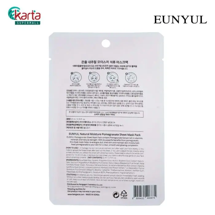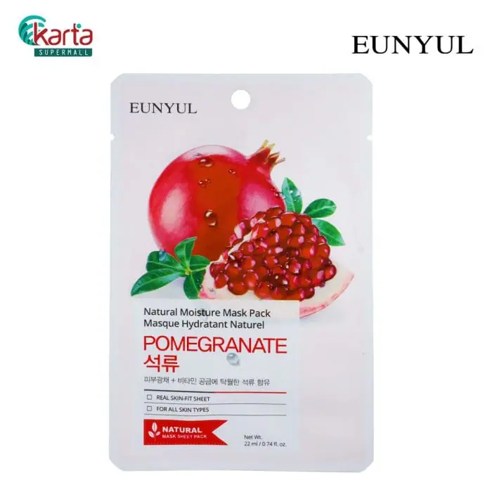 About EUNYUL Natural Moisture Mask Pack 22ml- Pomegranate X 10s SetOne of super fruits, pomegranate isn’t just lor eating.EUNYUL Natural Pomegranate Sheet Mask contains Pomegranate Extract rich in vitamins, minerals and natural estrogen. With its powerful benefits from pomegranate, this sheet mask helps re-energize dull, tired skin and maintain skin moisturized. Feed pomegranate to your skin far a dear, smooth and glowing complexion.Specification: 22mlSkin Type: All Skin Type, Dry Skin, Normal SkinBenefits: Brightening, Repairing, Whitening, Hydrating, MoisturizingSkin Concern: Dryness, Uneven Skin ToneDirections of Use:1. The EUNYUL mask sheet helps to boost skin hydration and texture. Before applying the mask sheet, kindly apply the toner first after washing your face with a cleanser to remove any traces of make-up and impurities.2. You need to spread out the folded mask sheet evenly after taking it out from the pouch.3. You need to adjust your mask’s position according to your eyes, nose and mouth’s positions and then you may adhere the Mask Sheet firmly on the face.*Please keep the mask on for 15-20 minutes so that your skin can effectively absorb the active ingredients.4. After removing the mask sheet, you can tap on your face gently to allow the skin to absorb the remaining ingredients on the skin’s surface.5. Gently massage with fingers to enhance the absorption of the remaining essence into the skin.Cautions:1. Stop using it immediately if you experienced any allergic response or skin irritations. If you continued to use, the skin problem might get worse. Kindly consult a dermatologist or seek medical advice accordingly.a) Kindly seek medical help if you experienced any of the symptoms such as red spots, tumefaction, urtication, skin irritation and etc.b) The above symptoms may also apply when you are exposed to direct sunlight.2. Don’t apply on wounds, eczema, dermatitis and so on.3. Storage Requirementsa) Please keep the pouch shut after using the mask sheet.b) Please keep the product out of infant and chlidren’s reach.c) Please keep the product away from direct sunlight and high temperature exposure.IngredientsWater, Glycerin, Propylene Glycol, Alcohol, Butylene Glycol, Sodium Hy-aluronate, Punica Granatum Fruit Extract, Vaccinium Angustifolium (Blueberry) Fruit Extract, Rubus Idaeus (Raspberry) Fruit Extract, Rosa Centifolia Flower Water, Portulaca Oleracea Extract, Scutellaria Bai-calensis Root Extract, Paeonia Lactiflora Root Extract, Lonicera Japoni-ca (Honeysuckle) Flower Extract, 1,2-Hexanediol, Betaine, Carbomer, Triethanolamine, Xanthan Gum, Polysorbate 20, Ethylhexylglycerin, Disodium EDTA, Phenoxyethanol, Fragrance
