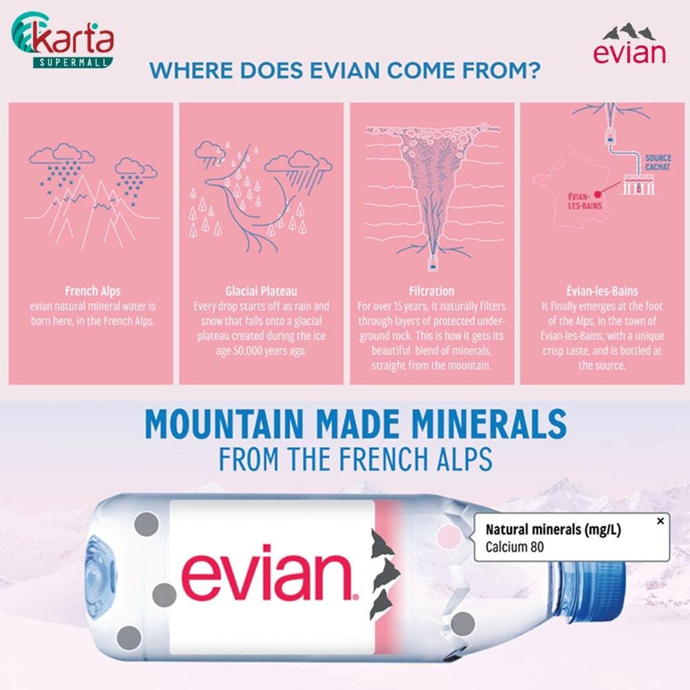 evian natural mineral water comes from the heart of the French Alps, a unique geological site in the world. For more than 15 years, it travels through the rocks, where it is enriched with essential minerals. The brand has been working for over 25 years to preserve natural surroundings of the source, in an effort to preserve evian natural mineral water’s exceptional quality for generations to come. Naturally pure and uniquely balanced, evian natural mineral water is a healthy choice throughout the day. Taste the purity of the French Alps In every sip.