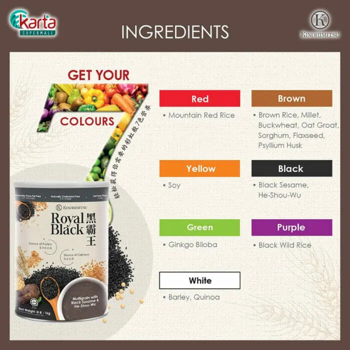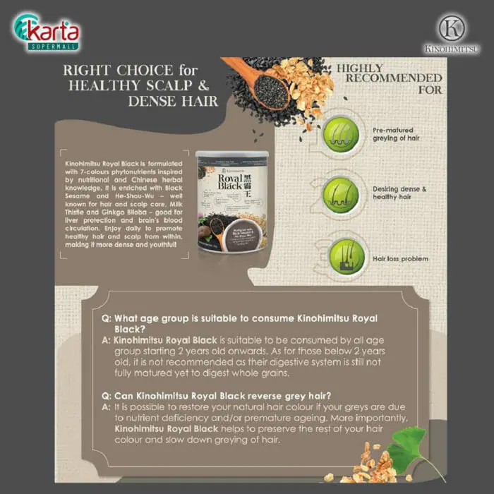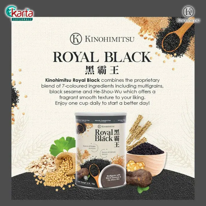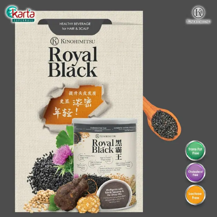Kinohimitsu Royal Black nourishes you with its proprietary combination of phytonutrients deriving from 7-colours ingredients. Enriched with black sesame and He-Shou-Wu which are well known for hair care, this beverage offers a fragrant smooth texture to your liking. Enjoy one cup daily to keep you energetic and shine with confidence!