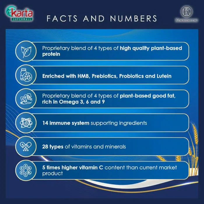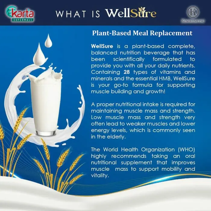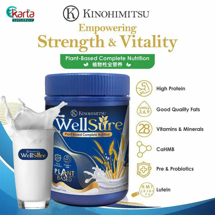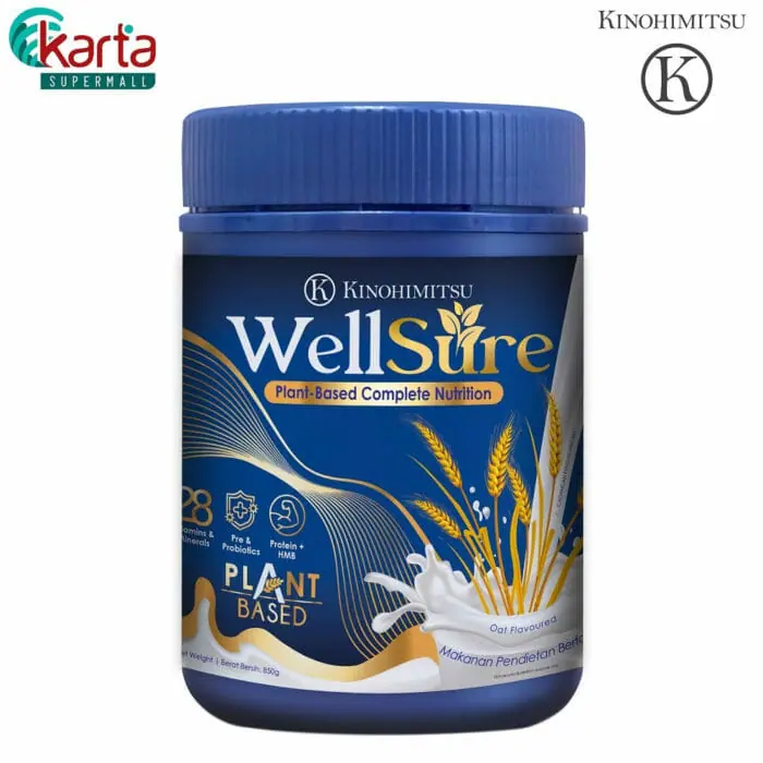 Kinohimitsu WellSure is specially formulated with plant-based proteins from Soy, Pea, Quinoa and Rice while enriching with HMB plus 28 types vitamins and minerals to build your nutritional foundation for an active lifestyle. It is a wholesome oral nutritional formula designed scientifically as dairy alternative to complete your daily meal nutrition need while providing you strength and vitality!