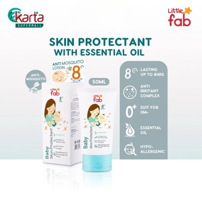 LITTLE FAB BABY SKIN PROTECTANT WITH ESSENTIAL OIL is a gentle Skin Protectant Lotion that is specially formulated with Panthenol and Chamomile Oil to help protect baby’s skin from insect bites, mild irritation and dryness, leaving baby’s skin soft and moisturized all day long. It is enriched with Essential Oil as an Aromatherapy that can help baby to be more relaxed!
