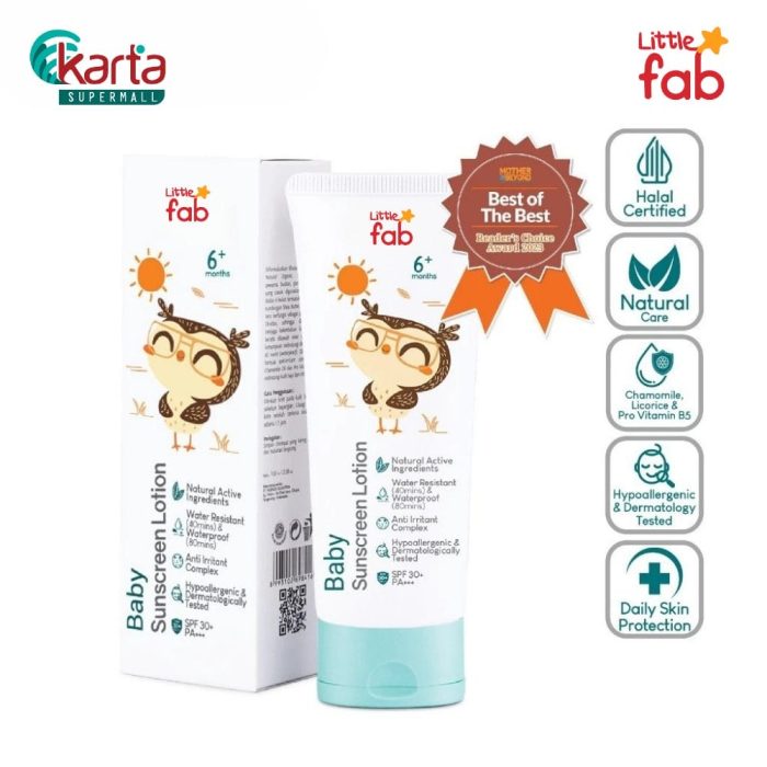 LITTLE FAB BABY SUNSCREEN LOTION WITH SPF 30+ PA+++ is specially formulated with natural organic ingredients, low irritant formula, non-added artificial coloring nor parfume, and is suitable for babies age 6 months and above, including those with sensitive skin. The product is enriched with shea butter, Beeswax, and Aloe Vera, which functions as a moisturiser and anti-oxidant to help maintain the moisture of the baby’s skin while under the sun. It’s also able to protect the skin when in the water for up to 80 minutes (is also waterproof). Apart from that, our sunscreen lotion is enriched with Licorice, Chamomile Oil, and Pro-Vitamin B5 formula to prevent mild irritation on the baby’s skin.