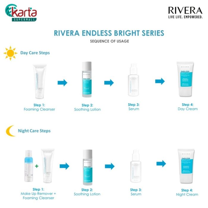 Rivera Endless Bright series is 2X more effective in brightening the skin and leveling the skin tone in order to help overcome the problem of dull and dry skin, dark spots, and acne scars so that the skin becomes optimally brighter with the help of key ingredients such as Alpha Arbutin, Glutathione, Pure Aloe Vera Extract, Chamomile Oil.