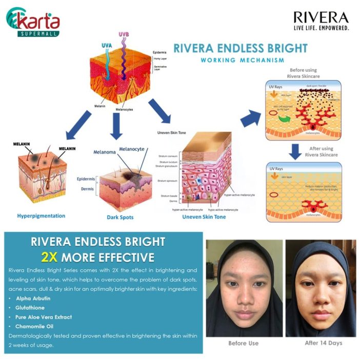 When outdoors, our skin is prone to experiencing dullness if it’s often exposed to road dust, cigarette smoke, other pollutants, and sunlight. High degree of air pollution will cause the impact of harmful UV rays and other key pollutants to become greater and thus, becoming a constant threat to our skin health. As a result, the issue of hyper-pigmentation that caused ueven skin tone and dark spots has become a major concern amongst many women. Therefore, RIVERA Endless Bright skincare Series is the perfect solution to rejuvenate the skin condition and thus, keeping the skin healthy, bright and well-groomed.